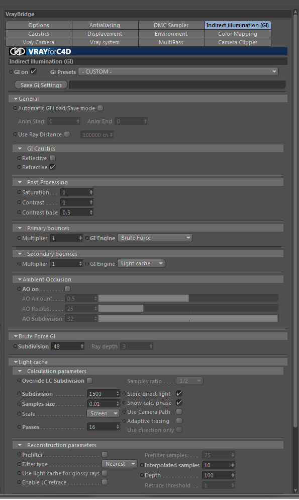 inoltre, utilizzando il vray compositing tag, puoi decidere di abbassare la qualitá del calcolo della GI su oggetti specifici (ad esempio, un tappeto peloso non necessita di un calcolo estremamente preciso, che ti porterebbe via molto tempo).