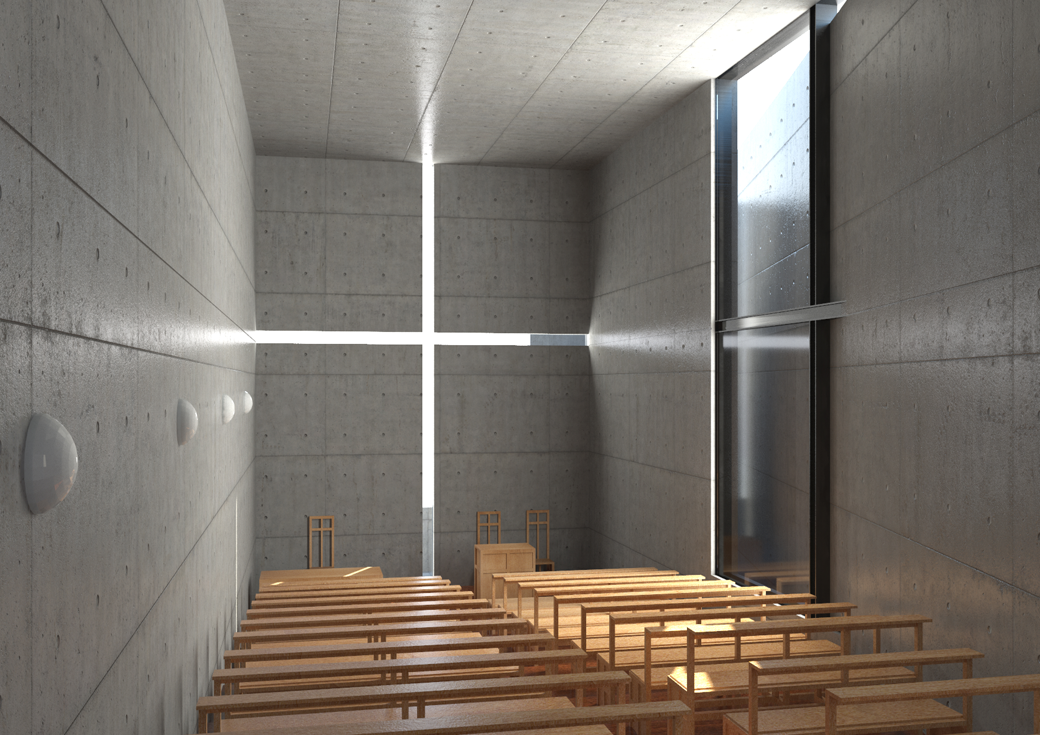 luci area al 50 per cento di intensità tranne le luci area della croce (intensità a 100% e filtro cool white) e quelle della vetrata di destra (65% e filtro cool white)
