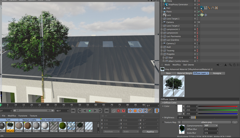 2_ la copertura del tetto in metallo non si vede nel modello ma solo nel render. E' applicato un materiale "Grigio" con un Bump per fare le scanalature. Questo l'ho ottenuto convertendo il materiale di Cinema in Vray.