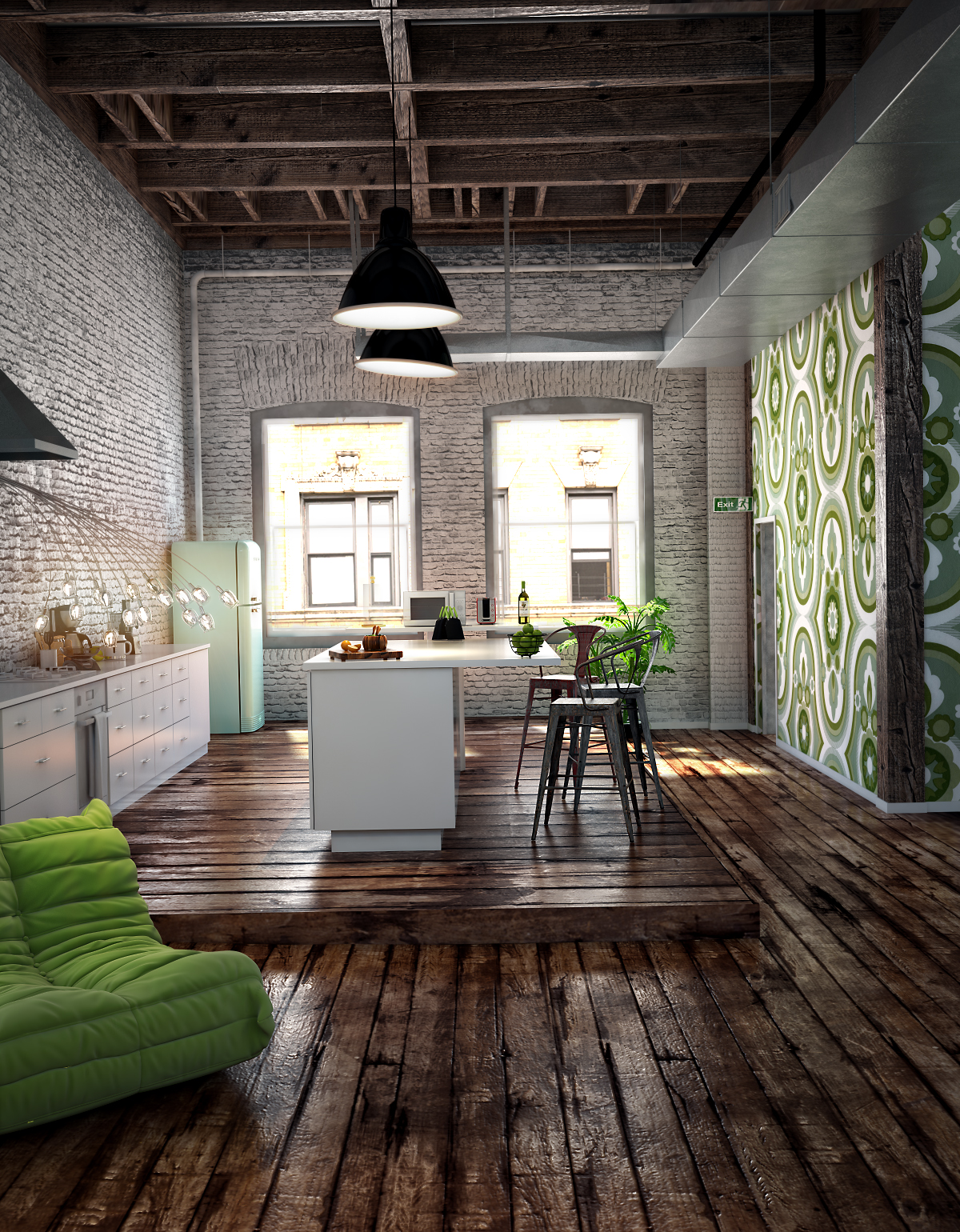 La piattabanda di mattoni sulle finestre forse è troppo alta; le luci artificiali le farei un po' più calde, nell'immagine originale si vede già il giallo all'interno del portalampade; la tex del pavimento dove l'hai presa mi piace molto (se è possibile saperlo!)
