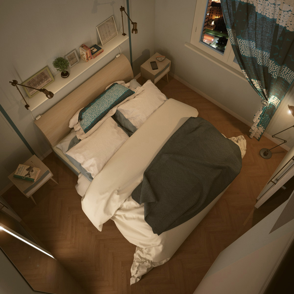 L'illuminazione diffusa diurna è prodotta da enviroinment con delle area alle finestre, mentre il notturno dall'enviroinment e da luci area sferiche nei punti luce. Postproduzione in PS per aggiustamento saturazione, luminosità e selective color sui neri e neutri.