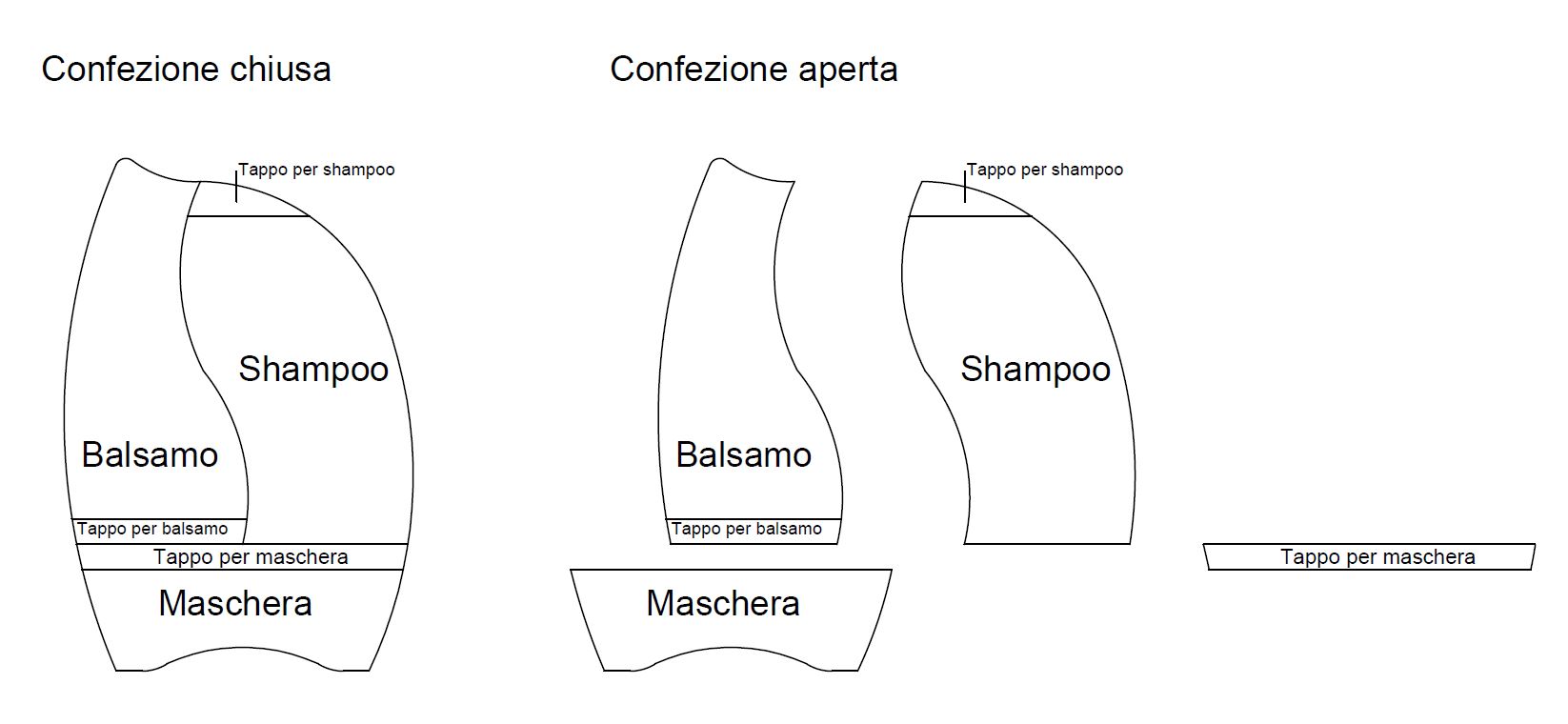 Una forma per il balsamo con il suo tappo, una forma per lo shampoo con il suo tappo e la maschera per capelli che ha anch'essa un tappo ma questo tappo funge anche da appoggio per le altre due forme...