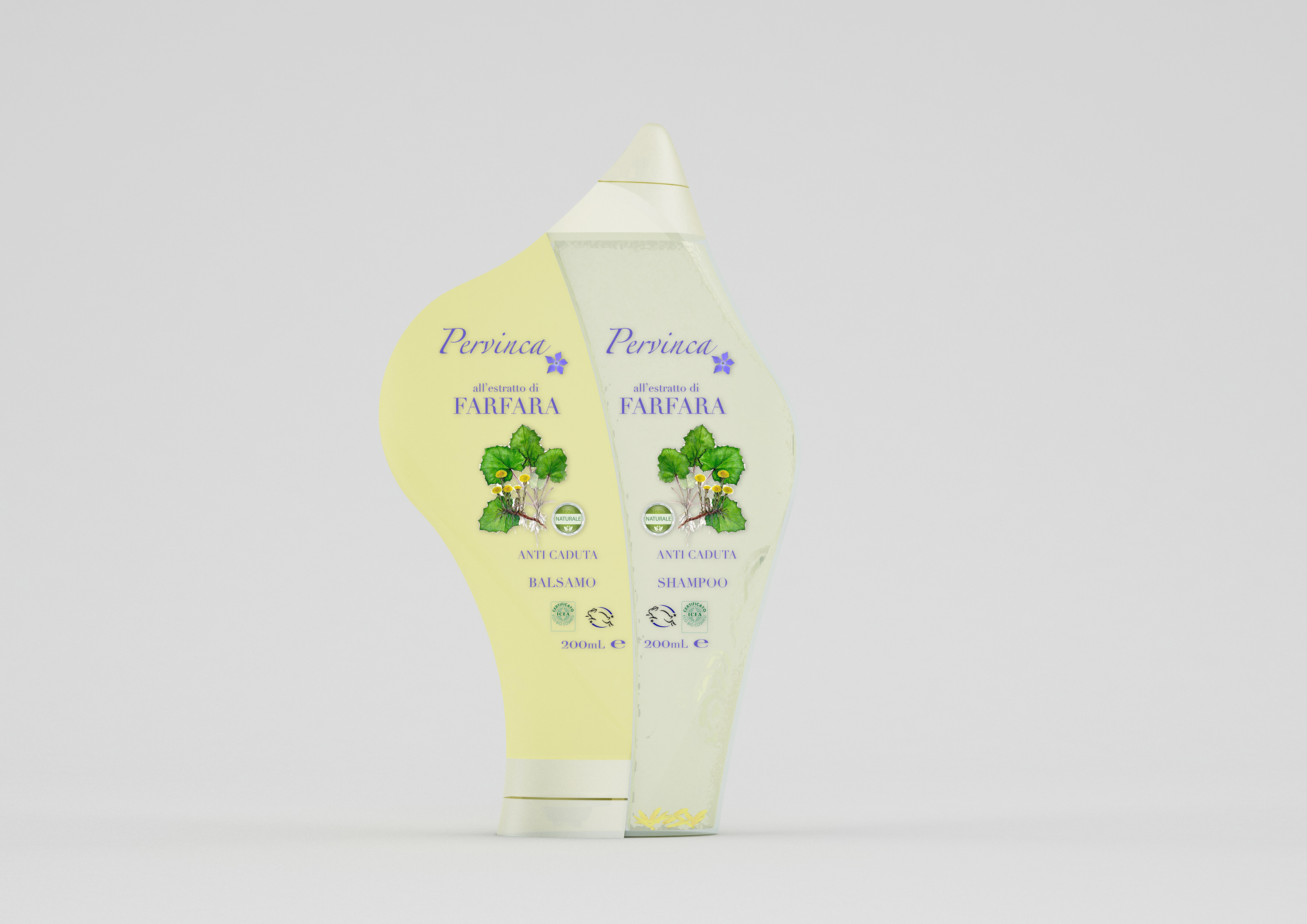 Forse è fuori tema ma proverei a proporre un'etichetta che evidenzi l' originalità e complementarità della confezione, tipo: flacone colore A con scritte del colore B e viceversa, etichetta "condivisa" tra i flaconi,...