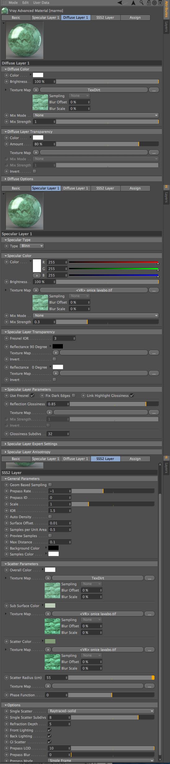Avendo tu bisogno di una lastra di marmo con un certo spessore devi utilizzare per forza l'SSS per ottenere risultati plausibili. Puoi simulare lo scattering volumetrico in vari metodi, senza illustrarteli tutti mi limito ad allegarti un'esempio di un'onice traslucido sul quale ho lavorato di recente. Ti basterà sostituire la mia tessitura con la tua ed avrai dei valori base dai quale partire. Se vuoi ottenere un'effetto "led-stripe" ti suggerirei anche di usare una singola luce d'area(lunga e sottile) piuttosto che molte sorgenti luminose più piccole.