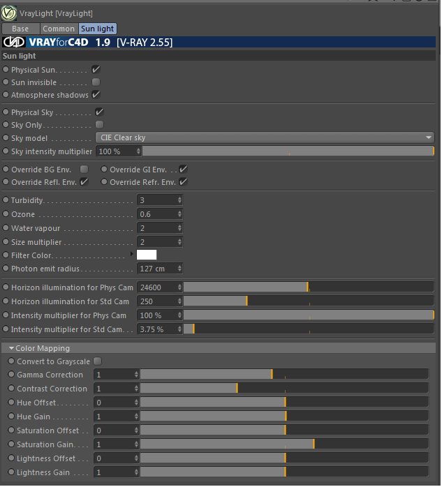 Ho usato come vedi una luce con targhet attivando il Physical sun e Physical sky dopo aver aggiunto sole e cielo fisico ho aggiunto una Physical cam con settaggi: Film ISO 200, F-Stop 3, Shutter speed 250