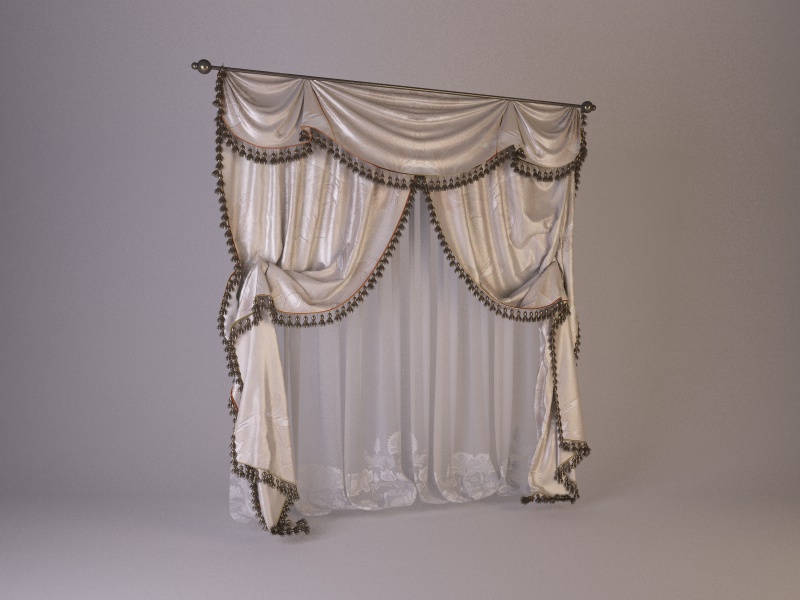 Tessuto semitrasparente creato con due diffuse, uno per l'intera mesh ( in cui ho inderito un falloff in trasparenza )e uno con maschera di trasparenza per definire i ricami in basso.