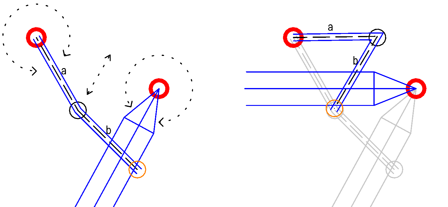 Uhm.. credo che la cerniera mobile B non vada in alto a dx ma in basso a sx, essendo leggermente spostato in quella direzione! Se non ci fosse quella leggera piegatura, le aste "a" e "b" sarebbero sullo stesso allineamento e il meccanismo probabilmente si bloccherebbe o ruoterebbe in direzione arbitraria.