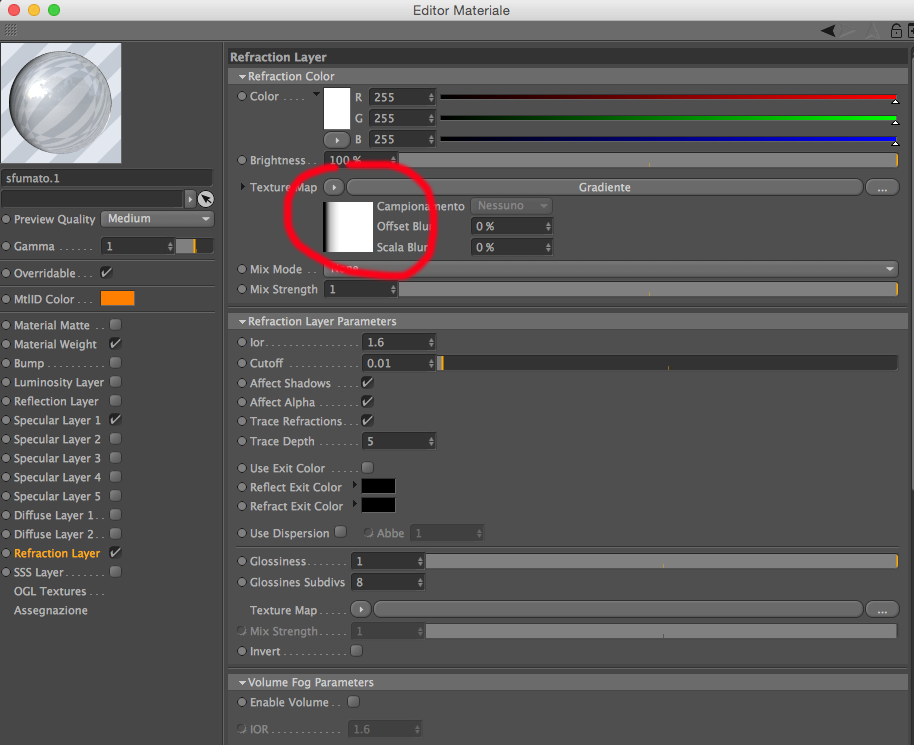 sapete suggerirmi come controllare la rotazione del refraction layer o la mappatura del materiale per raggiungere l'effetto voluto?