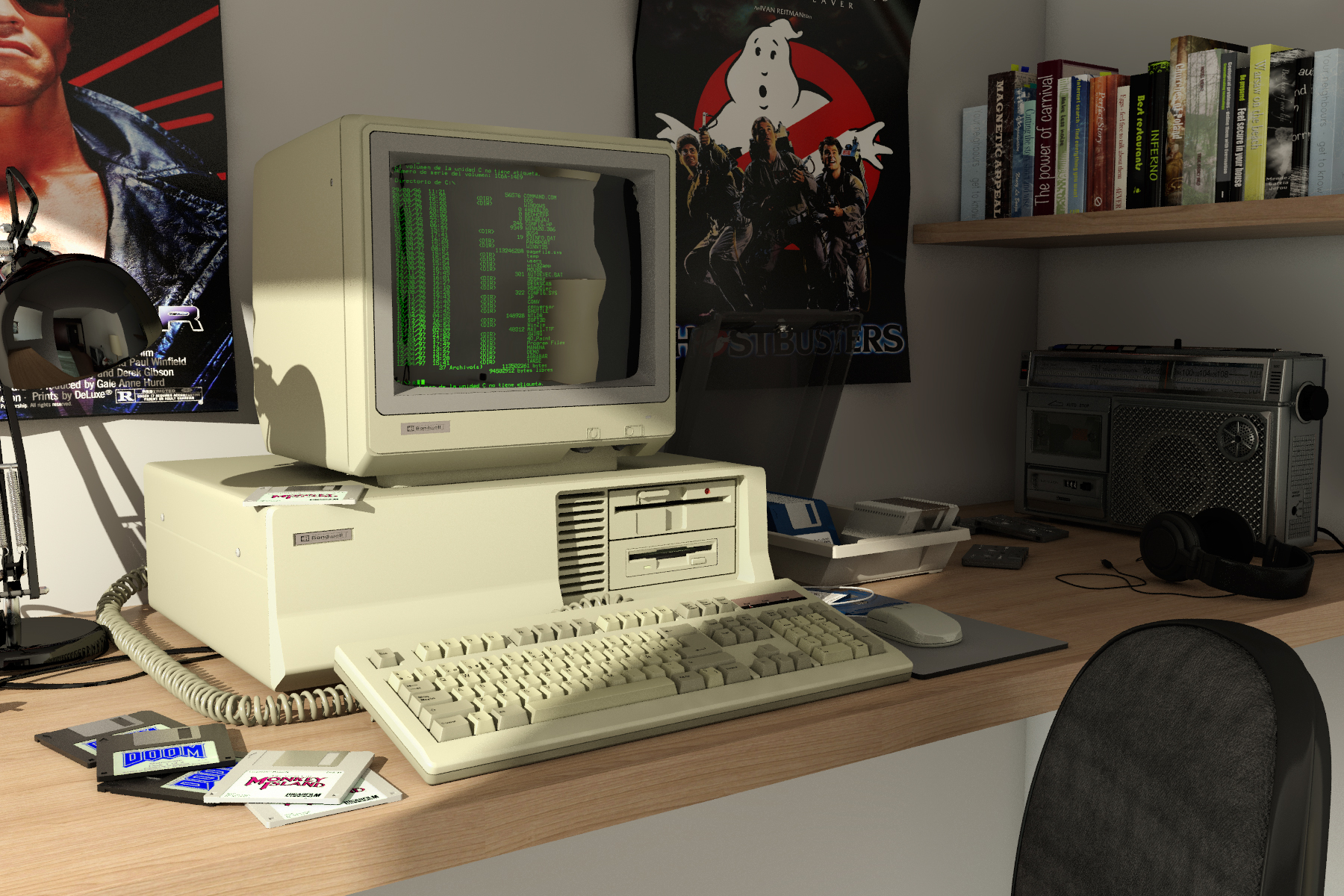 - il monitor sembra un modello a fosfori verdi, il che fa a pugni con i dischetti di DOOM e Monkey Island in primo piano che richiedevano una scheda grafica e monitor a colori, e anche perché essendoci il mouse si presuppone che ci sia una prima versione di Windows o qualche programma Grafico/Cad che necessita sempre di scheda grafica;
