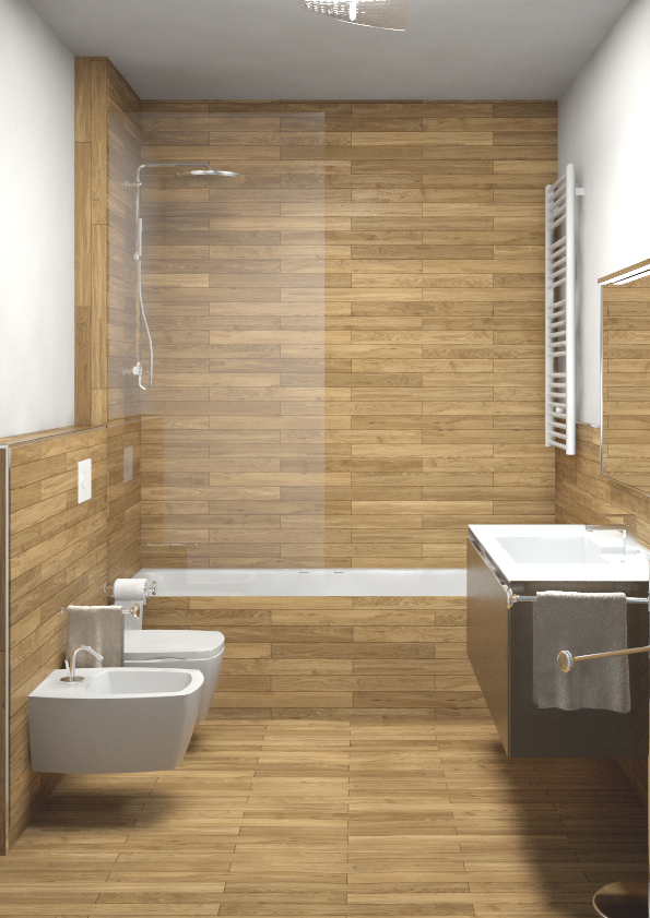 Quindi il pavimento e il rivestimento dovrebbero essere finto legno, mobile laccato opaco e il resto ceramica mormalissima bianca.