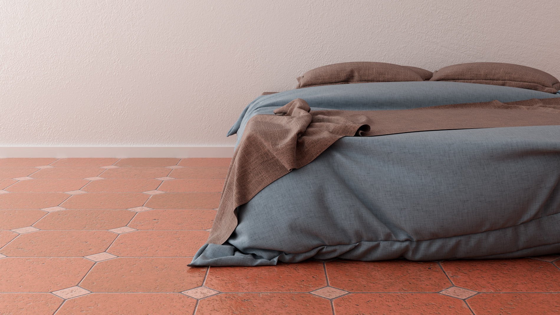 Molto meglio! Però il bump secondo me è un po' esagerato (sul tessuto marrone) e anche la dimensione della trama...fa sembrare tutto tipo di pvc stampato :) L'altro tessuto invece a mio parere rende bene. Non mi fa impazzire il pavimento (come disegno più che altro, il materiale è ok)..magari un parquet?