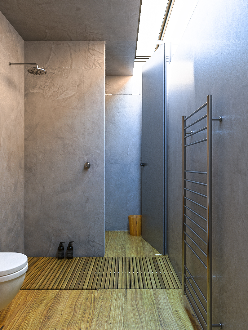 per me è venuto molto bene...cè qualcosina da sistemare a livello di geometrie tipo il muro in fondo che sembra non toccare terra, i listelli di legno riservati alla doccia (penso) li farei finire col finire del box doccia, in modo da individuare bene la zona (gusto personale) infine cercherei di perfezionare le luci che sembrano privi di vetro (forse voluto).