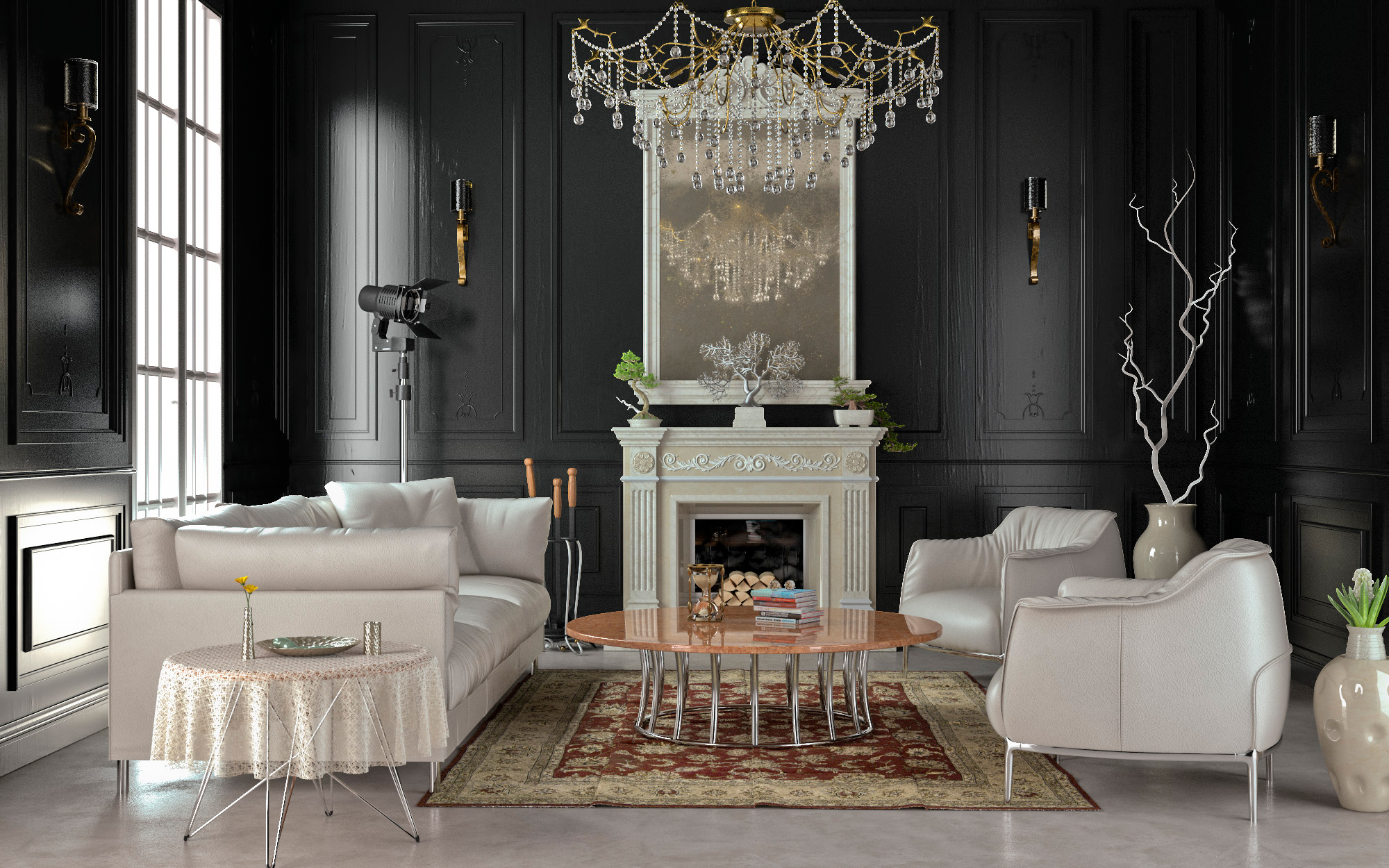 Importante sapere che gli arredi bianchi e pavimento chiaro, a differenza del render di bonapace che ha tutto su colori scuri, creano un problema di contrasto perche comunque illuminerai avrai o le pareti troppo scure o gli arredi troppo chiari, proprio questi cattureranno inesorabilmente l'attenzione dell'occhio di chi vede il render che si soffermerà ad oservare poltrone, camino e lampadario senza essere attirato verso la boiserie.