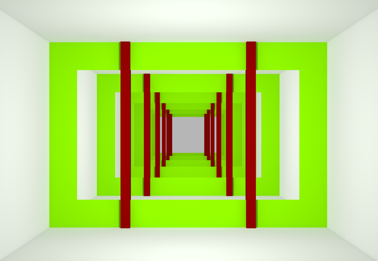 -problema che ho riscontrato è che ad un certo punto, l'effetto di infinito (per il motivo credo di illuminazione globale che non arriva più) arriva ad essere sfumato in nero, sia che si imposti il depth a 100-1000-10000 ad esempio. Ora..non capisco se è un problema di bug o se ci sono altri parametri che entrano in gioco.. comunque vi allego tre immagini dove si vede questo effetto di "rimbalzi" dovuti a come si imposta il trace depth...