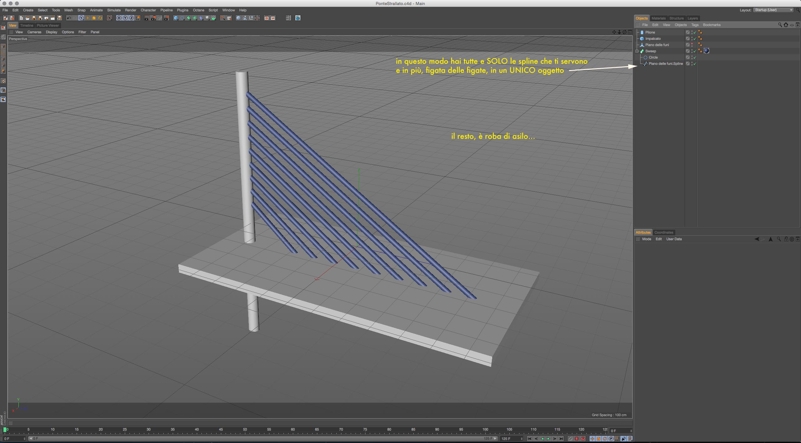 Adesso però ho bisogno del vostro aiuto per non impazzire. Mi hanno commissionato la renderizzazione di un ponte, che non esiste perché è ancora in fase progettuale, il mio problema è come realizzare in modo semplice tutte le funi di sostegno. Perchè tali funi partono da dei punti distribuiti sul piano orizzontale e convergono tutte su dei punti situali all'inizio del ponte.