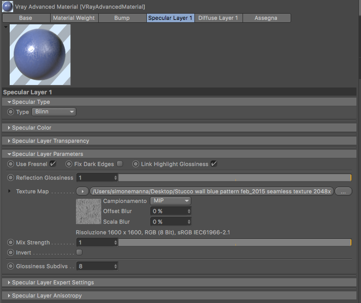 - aggiungi texture nel pannello specular layer parameters