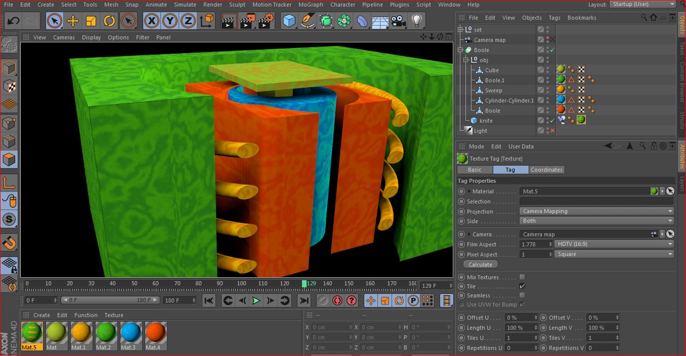 L´oggetto booleano é un oggetto unico o, meglio la risultante dell´oggetto booleano é un oggetto singolo che quindi accetta un solo materiale non potendo applicare ad esso selezioni, nel tuo caso ancora piú complicato perché l´oggetto risultante (quindi anche le selezioni) é dinamico.