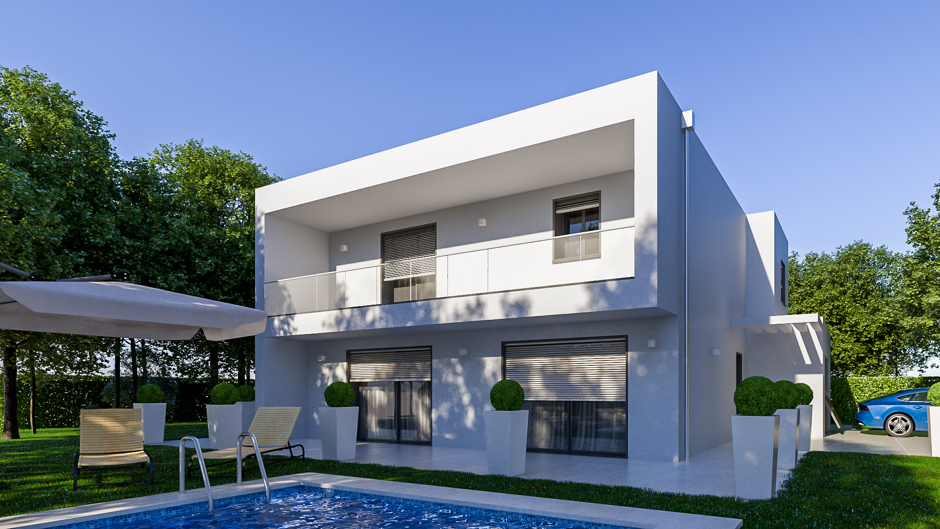 Quella di notte sarebbe anche interessante, ma quello che mi lascia perplesso è l'eccessivo effetto dei faretti alle pareti. Mi sembra che sparino un po' troppo. Magari cambiando tipo di effetto e mettendo qualche luce nel prato lungo il marciapiede.....