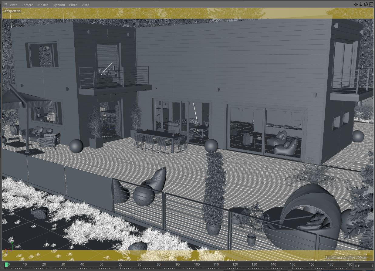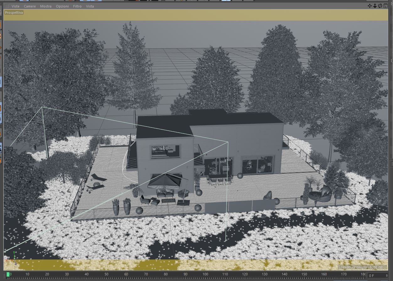 Poligoni: siamo attorno ai 25 milioni senza istanze. Le tavole del pavimento esterno, così come quelle di copertura della villa, ad esempio, sono tutte oggetti singoli che ho reso editabili dopo averle posizionate e non riunite sotto un singolo oggetto. Le piante sono praticamente tutte diverse una dall'altra e poi, ovviamente, qualcuna l'ho duplicata con istanza tipo gli arbusti e poco altro. Per l'erba ho usato MoGraph (ovviamente istanze attive). In sostanza ho cercato di fare (nei limiti del ragionevole) tutto quello che non si dovrebbe fare per risparmiare tempo.
