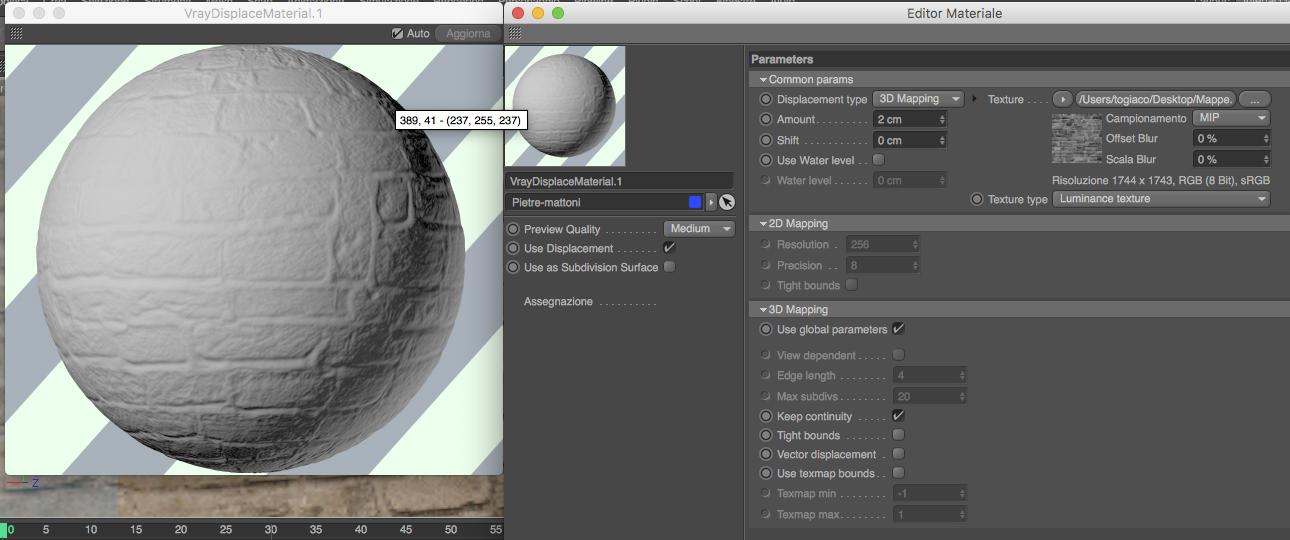 Infine, nel canale displacement, devi togliere la spunta da "use global parameters" e metterla nel "view dependent".