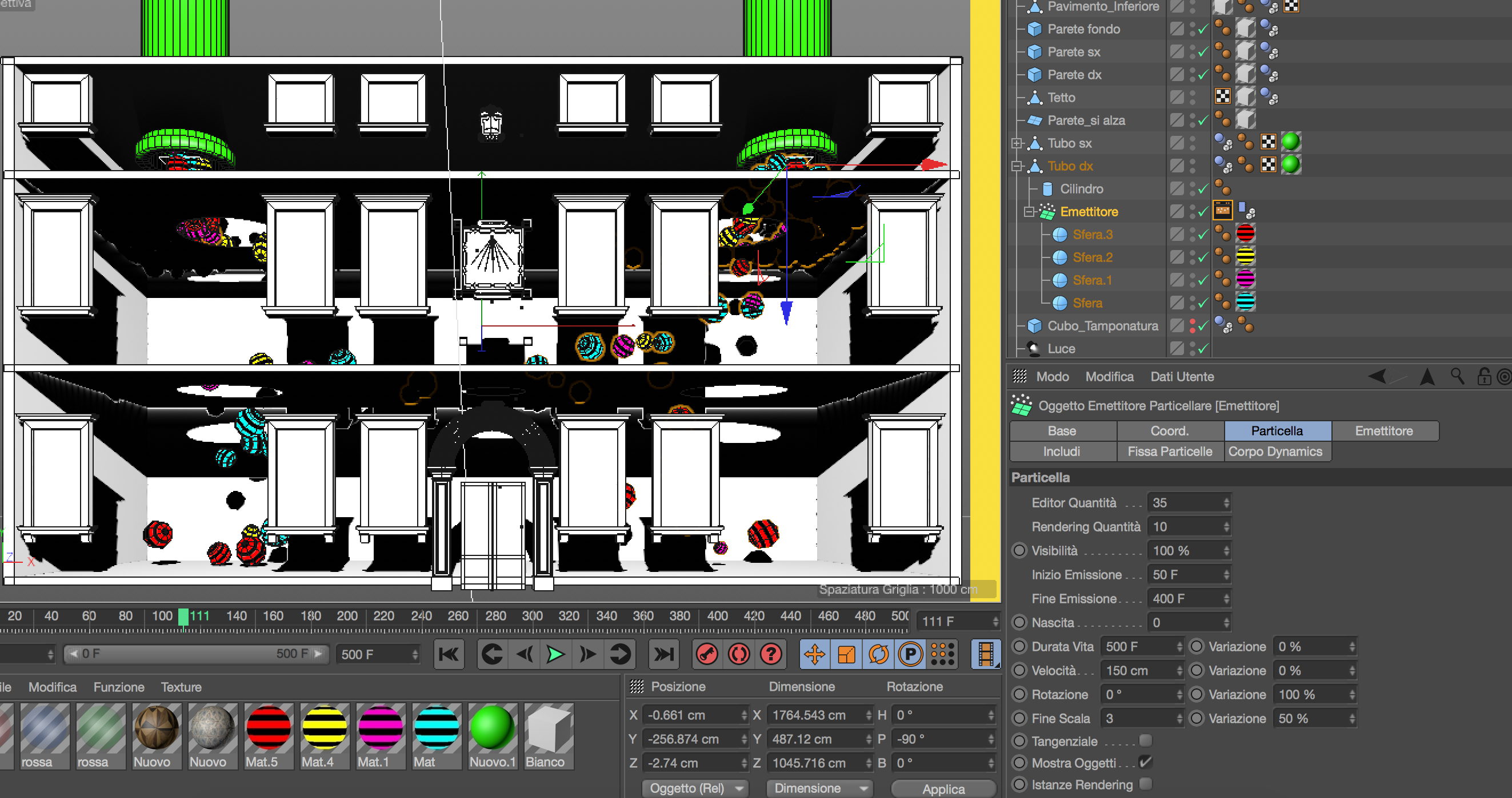 L'animazione nella viewport di cinema è completa però quando renderizzo non lo fa. Allego 2 img nelle quali si vede la differenza al fotogramma 105. Chiaramente nella viewport è corretta, nel visualizzatore immagini no.Ho controllato tutti i parametri dell' ''emettitore particellare'' di inizio e fine