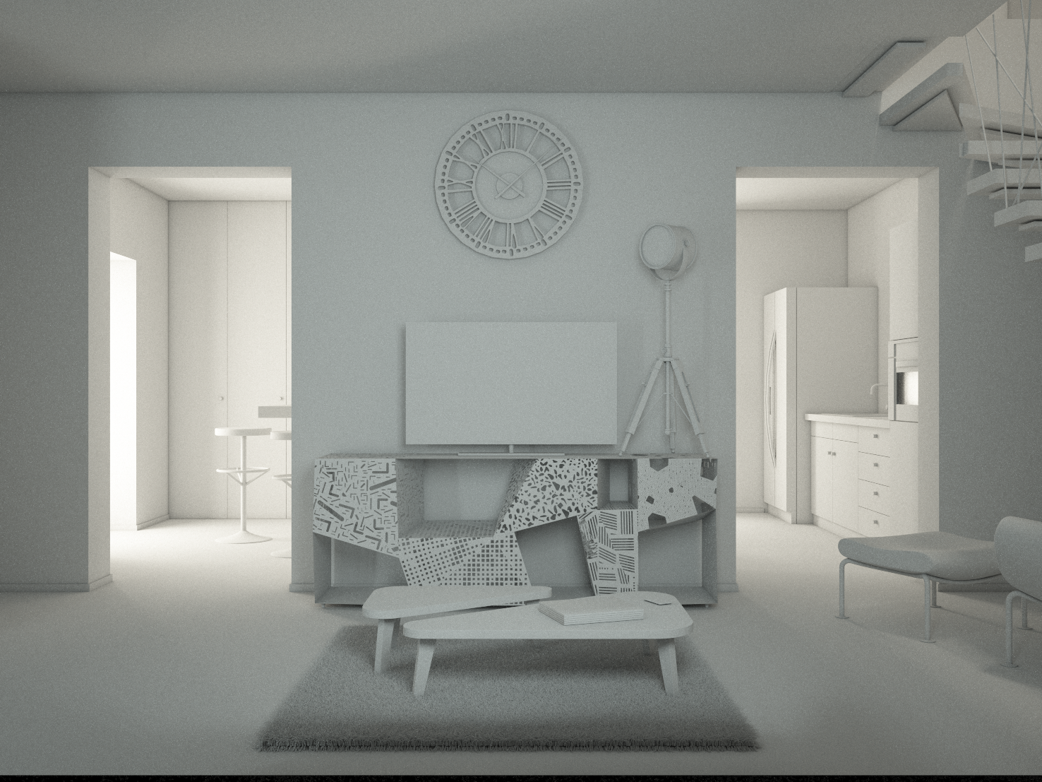 Allora, va gia meglio e ci stiamo avvicinando, hai solo una scena sfigatissima perché' la luce dietro le spalle, sopratutto di due finestre che vanno addosso alla parete, e' la cosa peggiore del mondo. Mi spiace per chi chi abiterà' ma avrà la luce sulla parete piattissima.