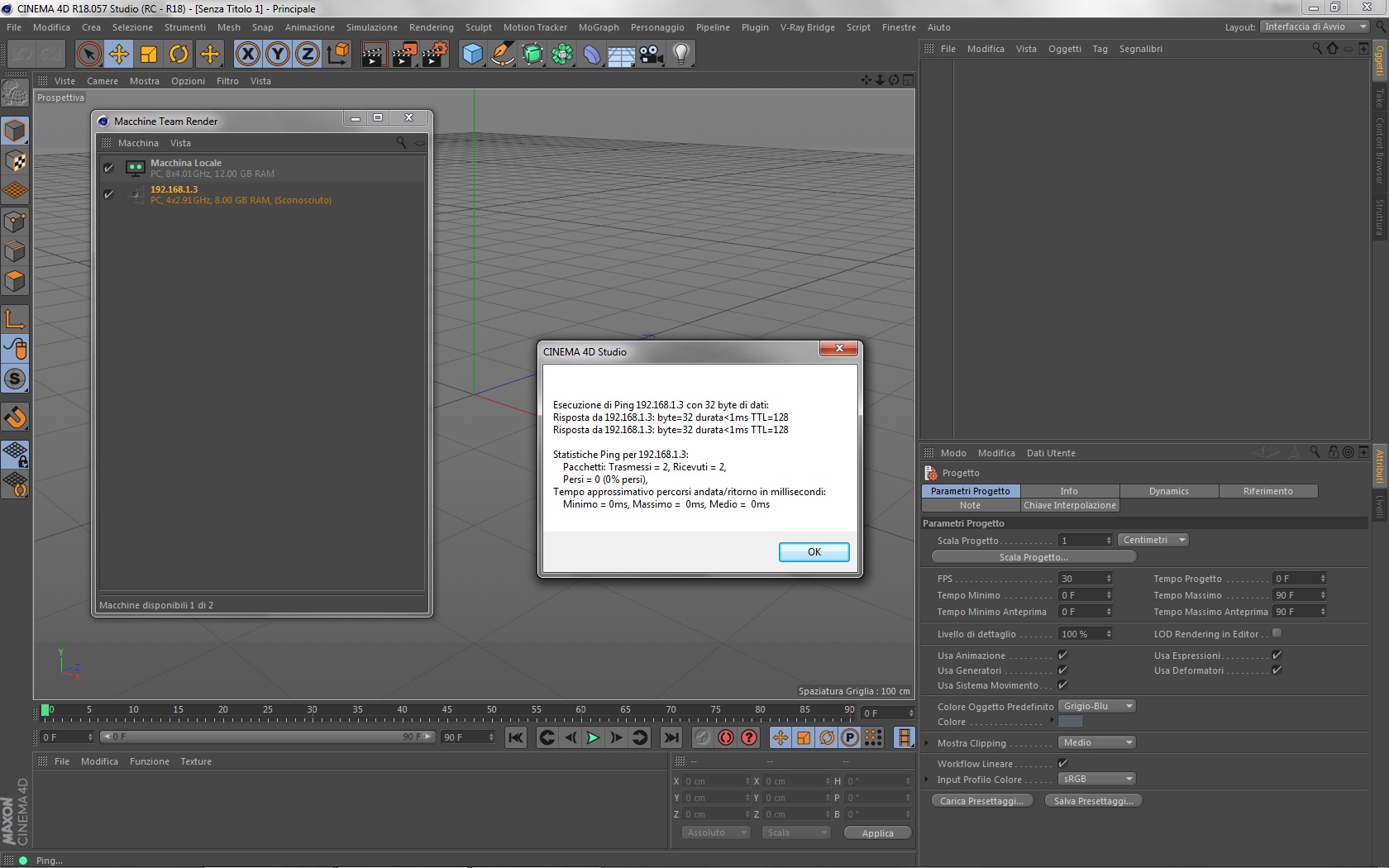 La cosa che ti va in time out, mi fa pensare che ci sia qualcosa sulle porte, un firewall o qualcosa che blocca....sicuro che il cinema4D esce sulla porta 5400? dovrebbe essere la porta di comunicazione...se per caso non riesce ad uscire non si riescono a sentire.