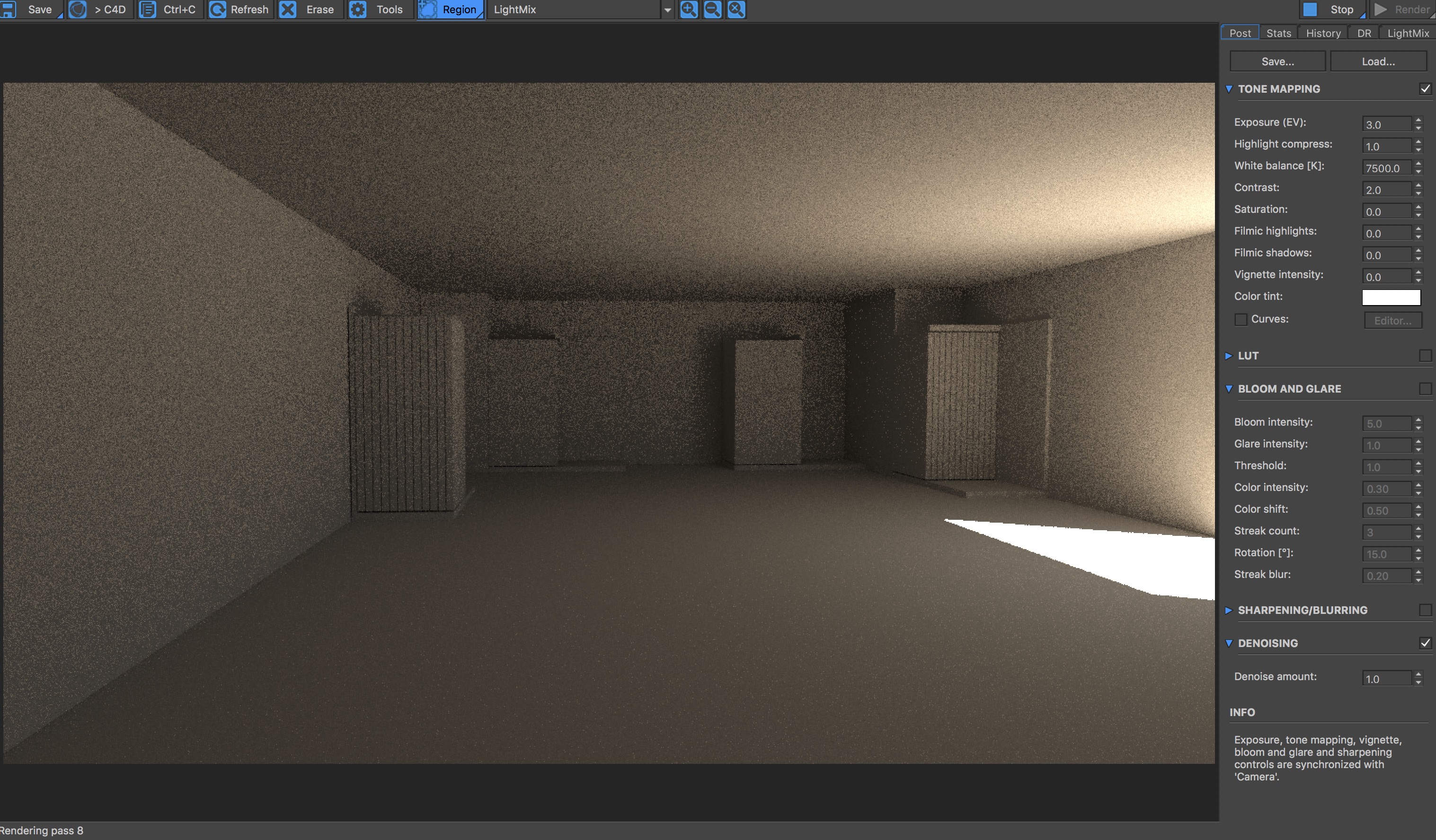 Poi ovviamente potresti aumentare l'esposizione usando l'esposition EV, che parte da "0" e metterlo un po piu alto, cosa succede? ti di brucia la scena, allora alzi un po sempre dentro la camera di corona il "Highlight compression" che comprime le alte luci fino a che non sparisce la bruciatura, puoi andare a livelli molto alti, dipende quanto se in overload con la luce. Diciamo che il gioco e' alzare l'esposizione della camera e alzare il compressore delle alte luci cosi' alzare solo i toni medi e medio bassi dell'immagine.