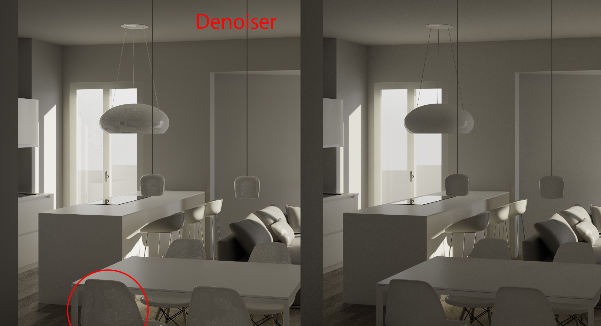 Non capisco perchè utilizzando il denoiser su alcuni oggetti lucidi (sedie e lampade tavolo) il disturbo aumenta...Per eliminare il disturbo a monte abbassi il threshold dell'AA, ma prima prova a impostare il denoiser in modalità RGB(se serve gioca con i parametri)