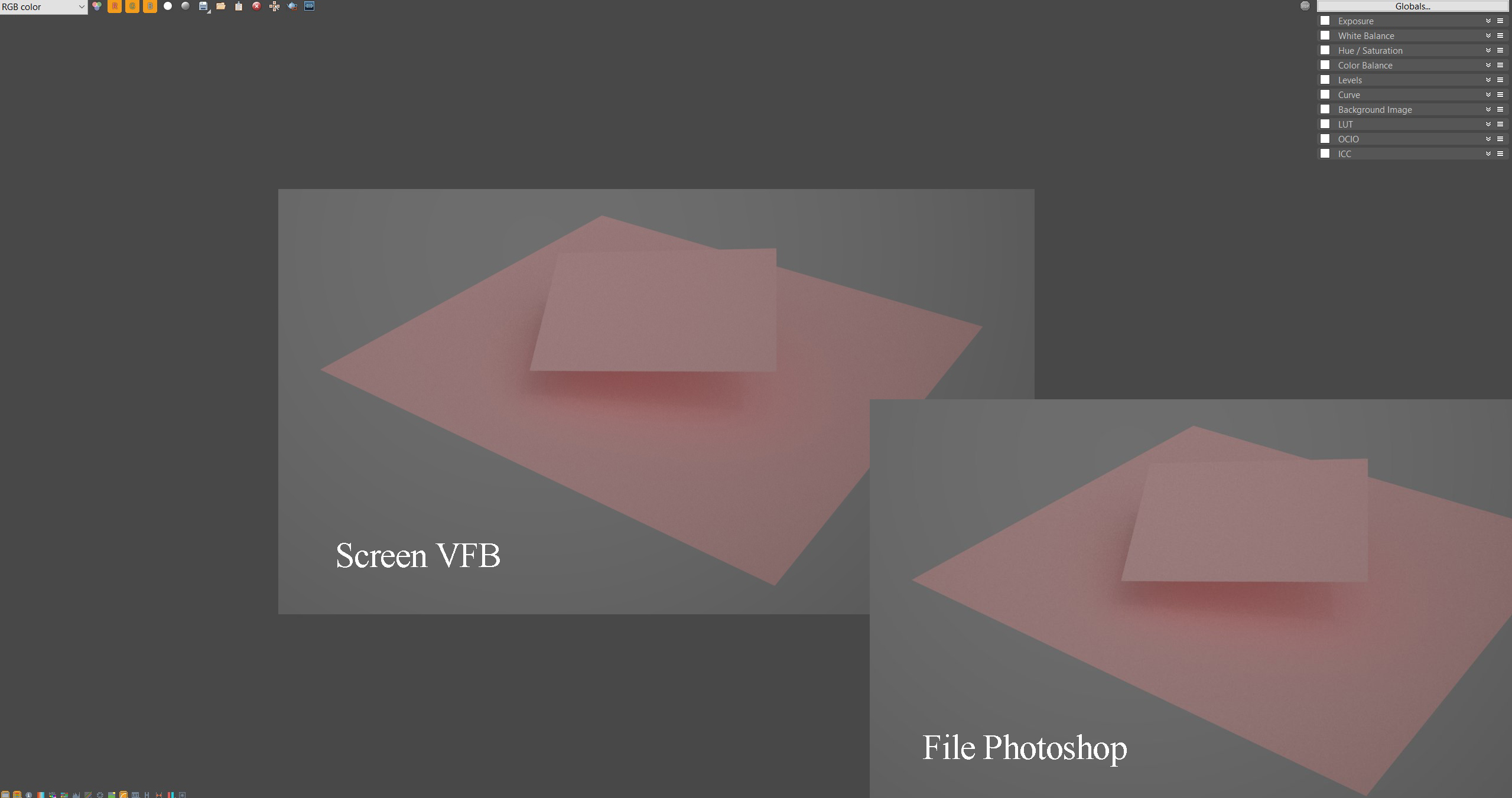 Nel VFB attivo la curva sRGB space e in qualunque modo salvo, che sia tiff, exr, jpg il file è sempre lo stesso che vedo su Photoshop.