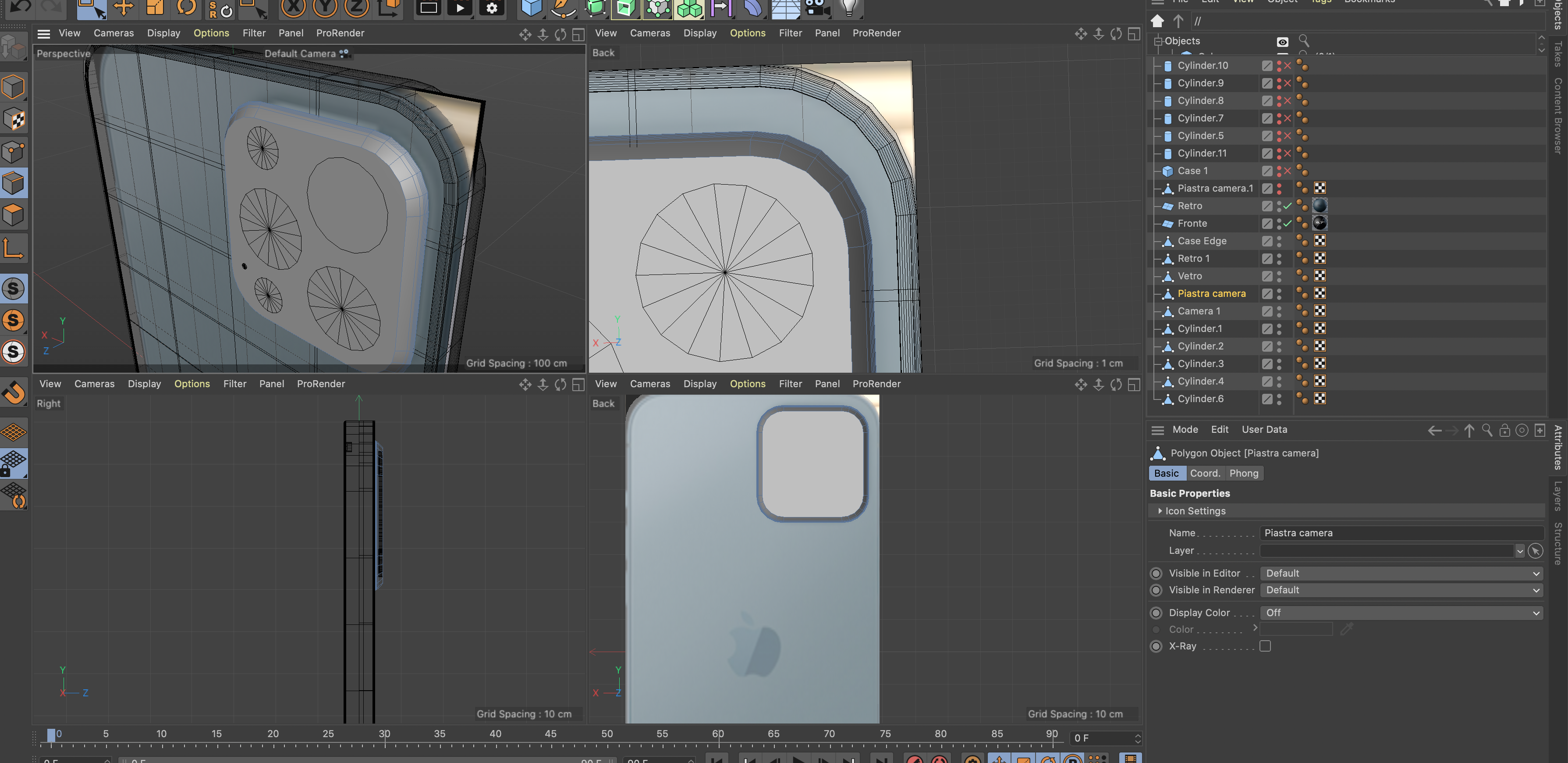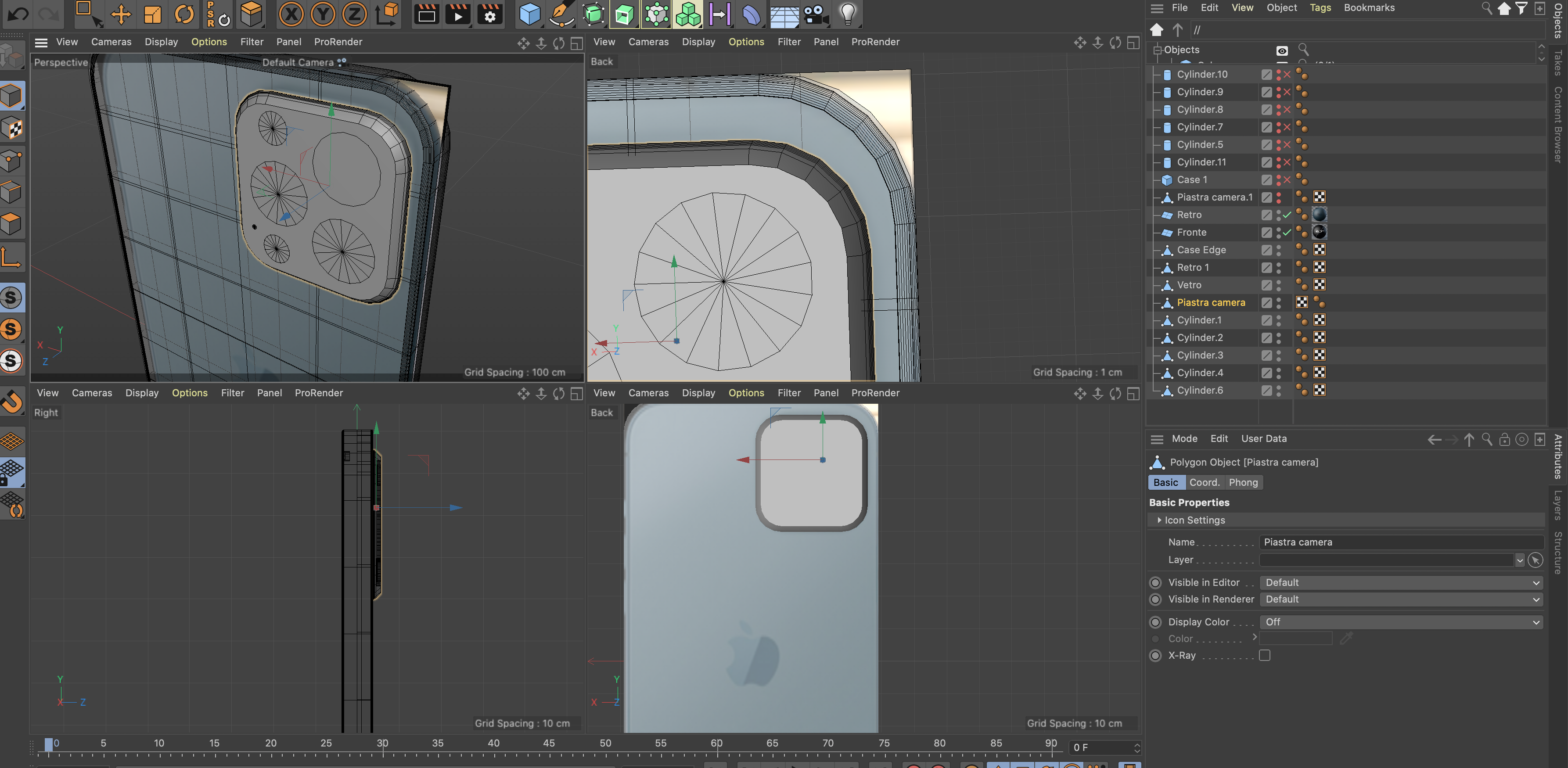 Dopodiché vai di Booleana, inserisci l'oggetto da tagliare e poi l'oggetto che taglia dentro (A-B) e ti troverai lo scanso del foro dentro la piastrina delle fotocamere...