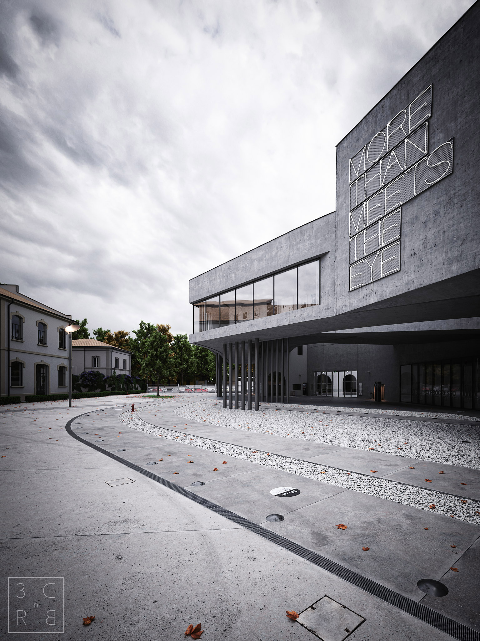 Posto alcune immagini, partiamo da un paio di viste sotto al portico del museo, una illuminata col physical sun e un'altra con un'hdr di un cielo nuvolo. Masterzone mi aveva giustamente suggerito di sistemare il tiling della ghiaia, tramite uno stratagemma e qualche foglia ora si nota a fatica;)