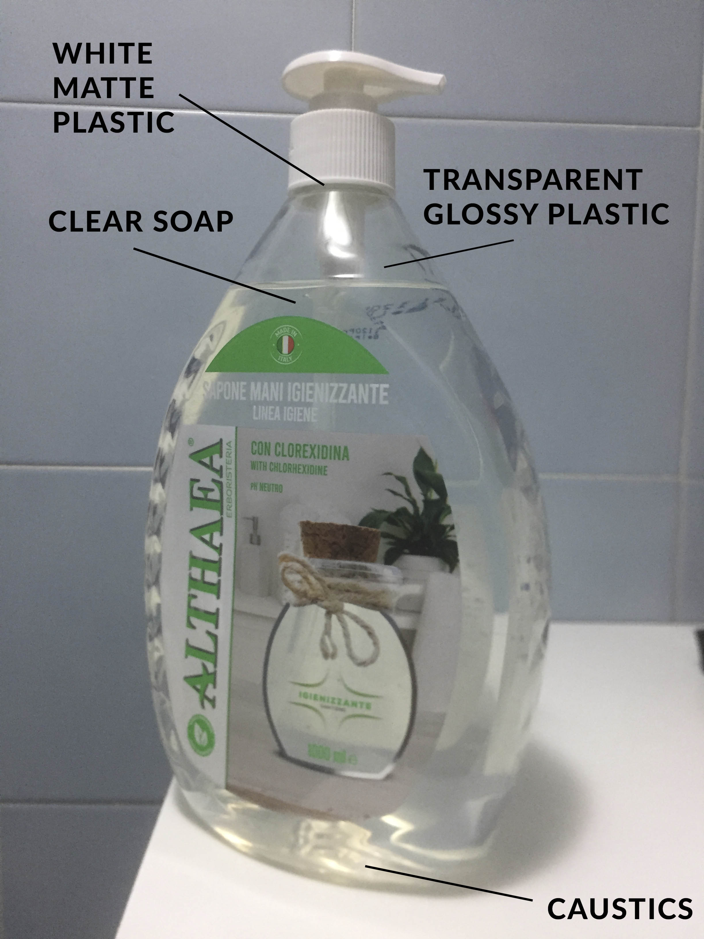 Giusto per un quadro più completo posto a seguire due scatti con telefonino della bottiglia reale del sapone igienizzante.