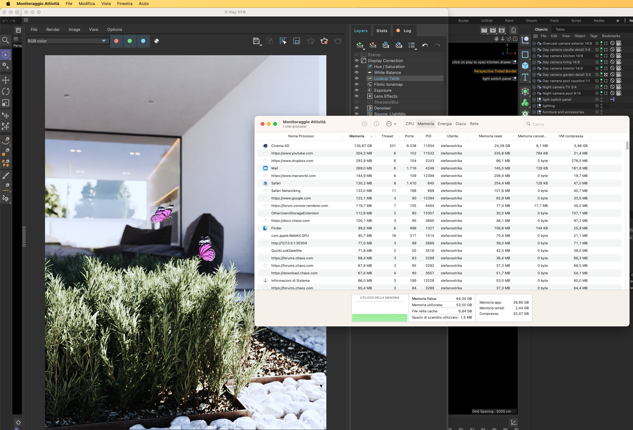 Per verificare che la memoria non fosse realmente saturata ho aperto una scena (con fur, displacement, verde ecc) e come vedi l’ha calcolata senza problemi, portando la “memoria reale” a 24GB che si sono andati a sommare agli altri portando la voce “memoria” a oltre 130GB.