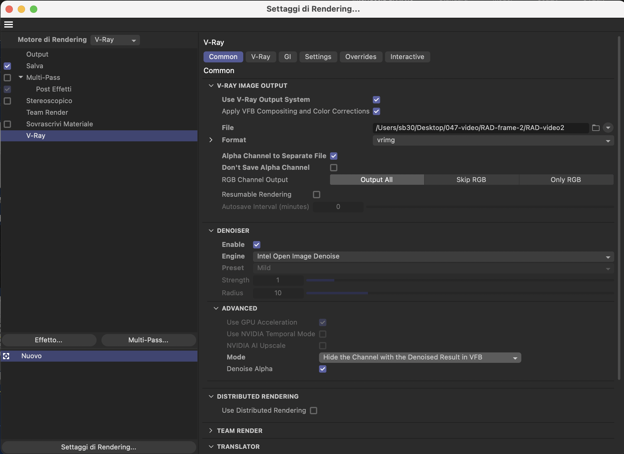 - Sul Mac lancio il render dell'animazione con VFB e faccio salvare le .vrimg con il canale denoise non applicato.