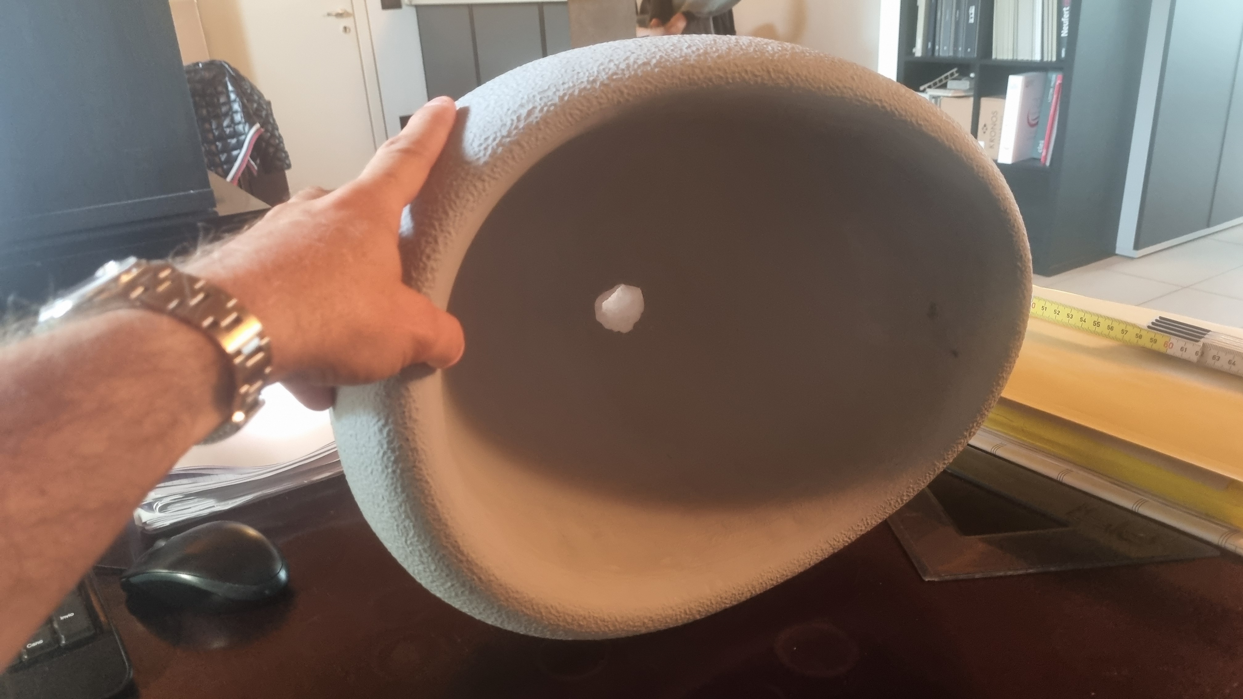 ora mi chiedono di realizzare un 3d con un oggetto che con autocad non riesco a realizzare. praticamente si tratta di un "guscio" delle dimensioni di circa 37 cm di lunghezza, 32 di larghezza e una ventina di altezza. lo spessore variabile del bordo è di circa 3/5 cm.