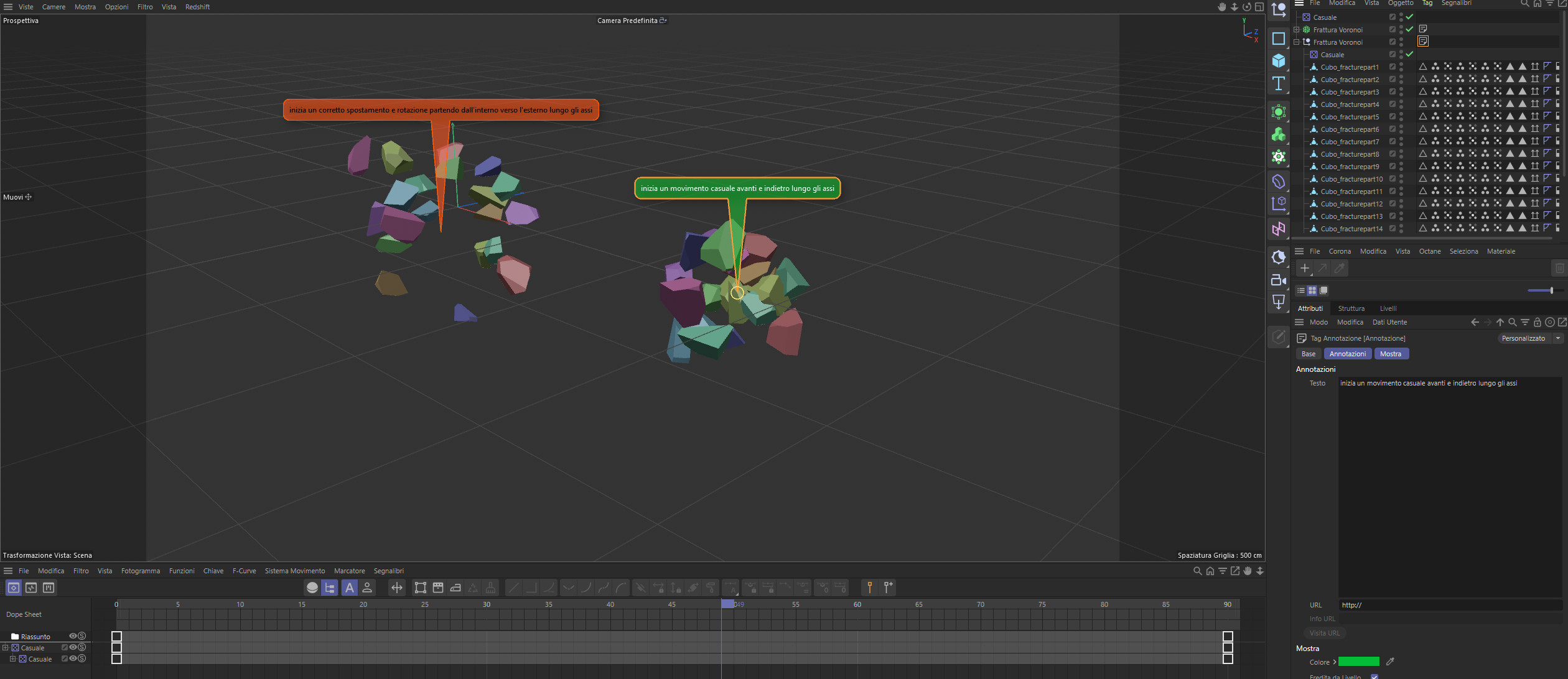 Ho realizzato una frattura Voronoi (ad esempio ad un cubo) e ne controllo perfettamente i movimenti con l'effettuatore Casuale; il problema sorge quando trasformo in singoli oggetti la frattura voronoi con "Stato corrente ad oggetto" ... l'effettuatore casuale non riesce più a garantire gli stessi movimenti e rotazioni, ma distribuisce gli oggetti in modo arbitrario. vorrei sapere se qualcuno riesce a programmare una funzione di Xpresso che riesca a controllare il movimento e la rotazione di più oggetti contenuti in un oggetto nullo. Vorrei sapere se qualcuno riesce a programmare una funzione di Xpresso che riesca a far controllare il movimento e la rotazione di più oggetti contenuti in un oggetto nullo, con un'espansione (movimento e rotazione) dal centro verso l'esterno.