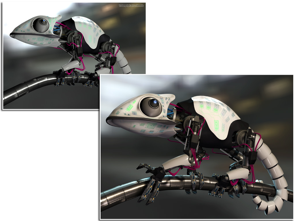 P.S. potresti fare una inquadratura in modo che si vedano i due occhi del camaleonte, una delle cose che lo caratterizzano di piu è che possa muovere le pupille in modo indipendente, potresti anche metterlo sopra a qualche circuito elettronico tipo una motherboard e dargli la stessa testura cosi si mimetizza :)