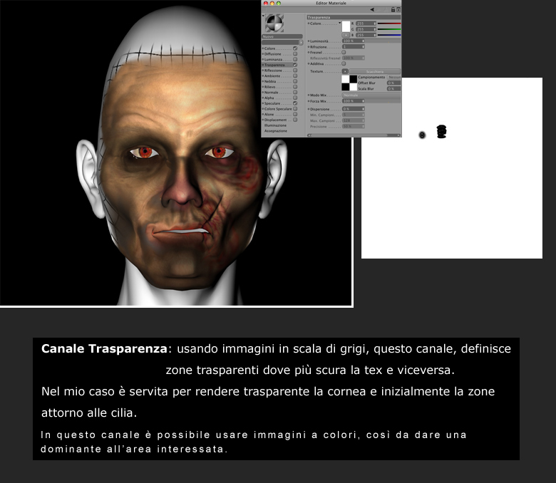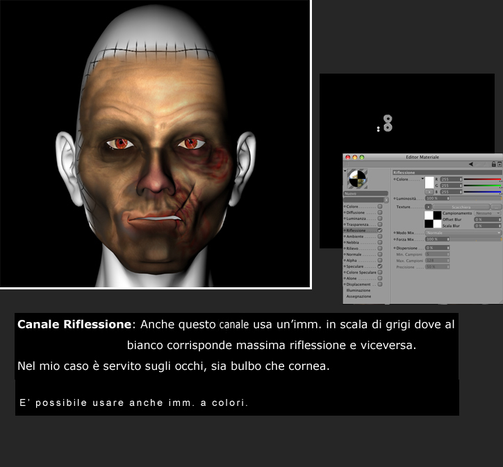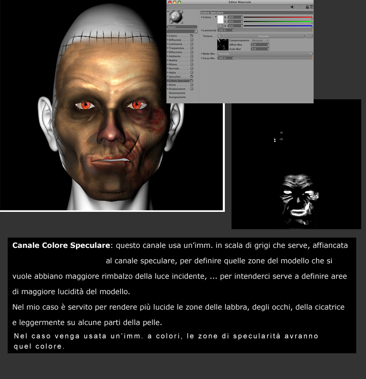 Posto finalmente le spiegazioni, molto sintetiche, dei canali tex che ho usato per il volto, ... mi prendo ancora del tempo per la parte del SubSurfaceScattering e dell'illuminazione.