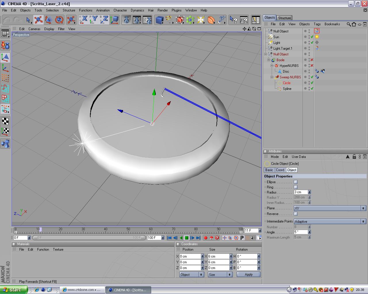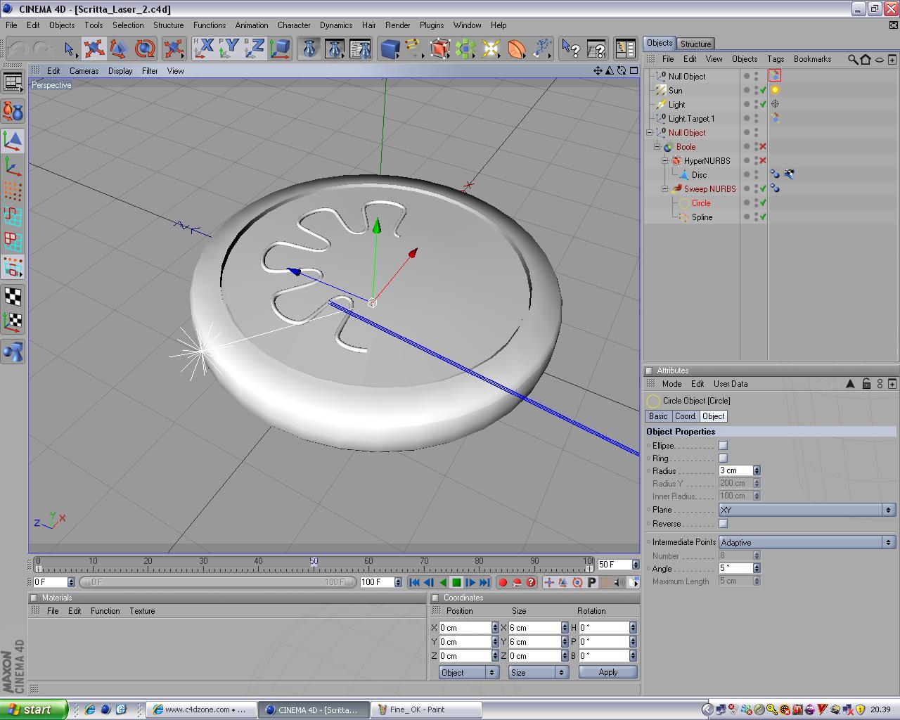 Avrei fatto facendo una sweep nurbs con la figura (spline) che voglio incidere eppoi metterla in booleana con la medaglia. Per simulare il laser ho messo una luce, il cui target ho associato alla figura (spline) con il tag "allinea a spline".