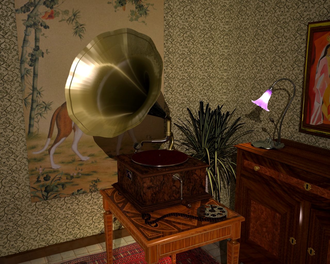 mah veramente nella scena ci sono tre luci, una al centro della stanza ...quella che simula il lampadario, una di lato, e quella che esce dalla tiffany che è uno spot... ma mi rendo conto che lo spot ha una luce troppo bianca e alta ... l'aggiusto.