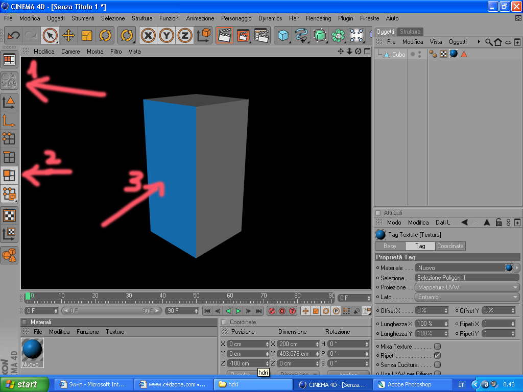 Inoltre se vuoi agire solo su una parte del modello, devi applicare un materiale distinto a quella parte ed un altro al resto del modello...questo non vuol dire che devi creare due materiali diversi, ma semplicemente che lo stesso materiale lo devi applicare ai diversi oggetti, separatamente, in questo caso all'anta e al resto del mobile.