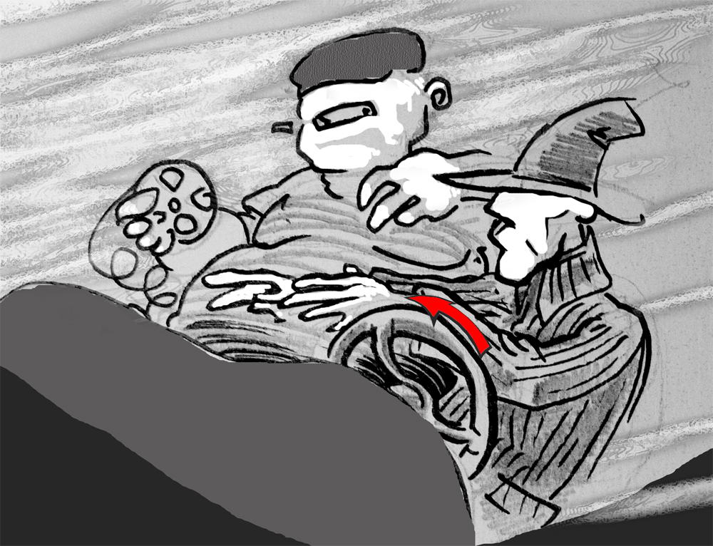 Per chiarire meglio quanto dicevo sulla dinamica del litigio nell'abitacolo, ecco un disegno che illustra l'azione ... Stige, scioccato di fronte a Garza che sta levando i nastri con accortezza zero, si fionda per salvarli, ... la mano destra ha agio, ma la sinistra si trova in traiettoria il volante, che gira ...