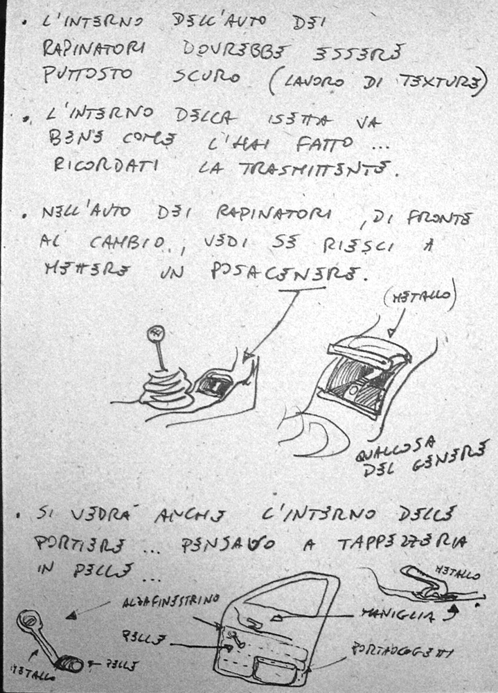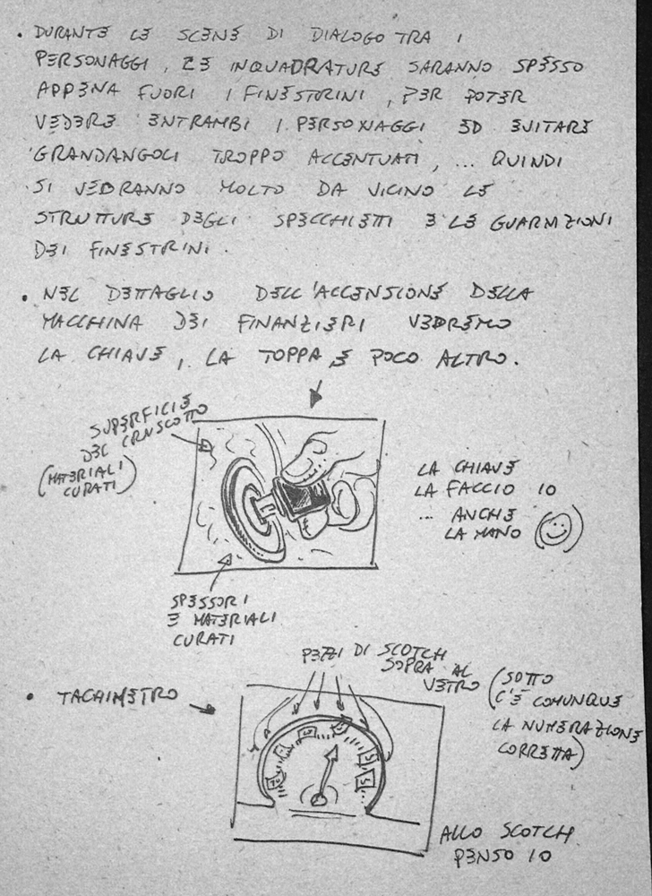 poi così caricaturale, ... nonostante questo c'è una volontà di esagerazione ... ad esempio, proprio la parte della ruota, ha in se quell'estremizzazione che, più ancora che nel suo aspetto, si propone tra le righe della trama e del modo in cui pensavo di trattarla ... non ho ancora deciso precisamente, ma la causa del danno parte da un litigio dei due personaggi che vorrebbero ascoltare musiche diverse ... il guidatore molla il volante e cerca di impedire all'altro di sostituire il nastro ... la baruffa nell'abitacolo fa perdere il controllo del mezzo, che, con una sterzata improvvisa, data dall'impigliarsi nel volante, punta sulla ruota e vi incanala tutto il proprio peso e spinta ... a questo punto, in una logica di esagerazione, la ruota fa perno, ma non regge e, in definitiva, esplode separando tutti i propri pezzi ... il cerchione salta assieme ai bulloni sparati come proiettili, il copertone s'impiglia e accartoccia su se stesso ... diciamo che la chiamerei un' "orgia dinamica".
