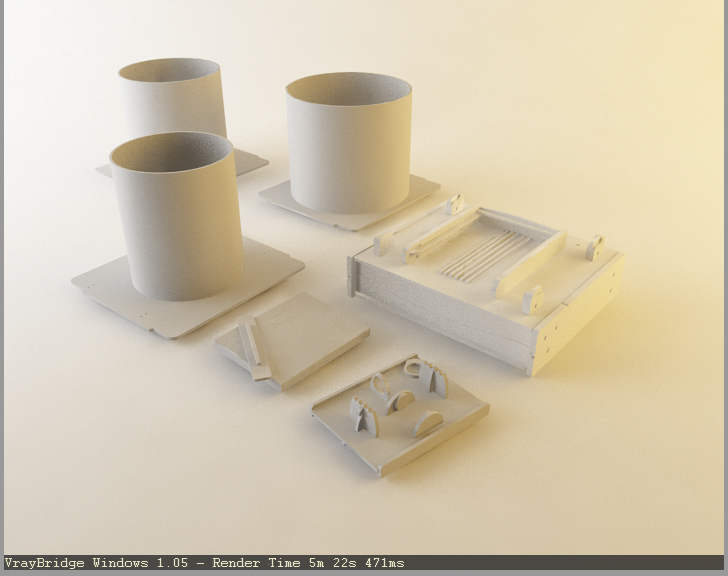 sono apparse quelle ombre sotto i tubi ,la scatola e l'altro apparecchio di plexiglass ,dopo aver fatto il render mi sono accorto di essermi dimenticato di spuntare refractive nella GI caustics