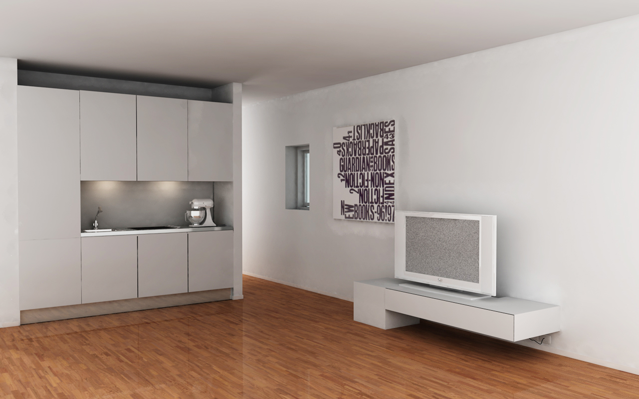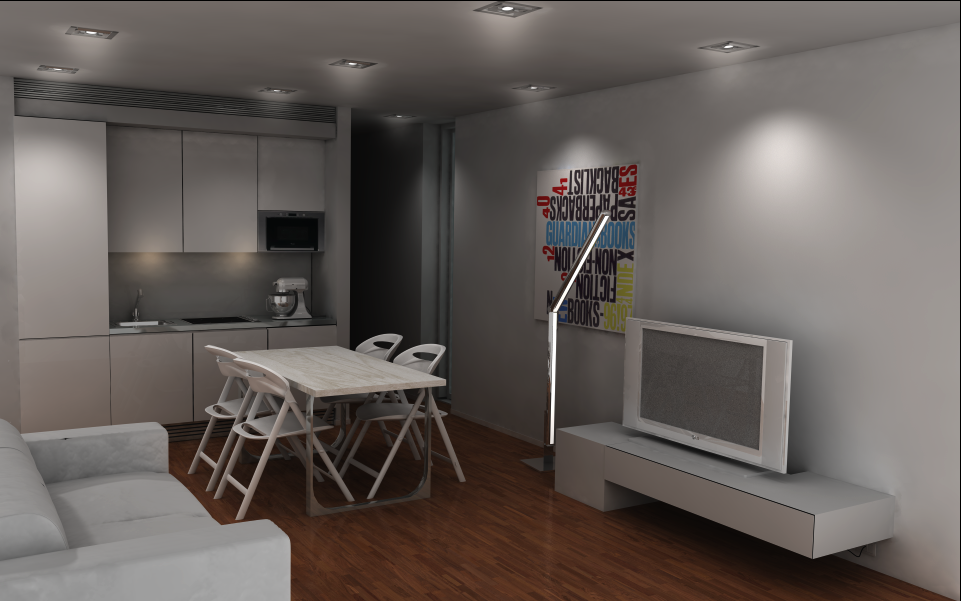 Spaziale anche la presa elettrica sotto il mobile del plasma (cambia però lo schermo del TV: quel grigio chiaro è orrendo, mettici un'immagine con un po di luminanza o lascialo spento cioè nero).