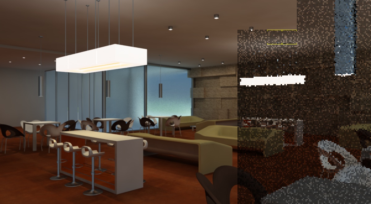 Sto lavorando a una vista interna della hall di un albergo, ma dopo svariate prove non riesco a togliere quel fastidioso riflesso rossastro che il pavimento fa un pò dappertutto!