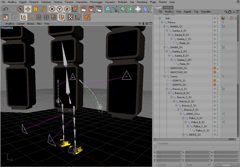 Uso il classico sistema di Bone (quindi niente joints…). Applico i Tag “IK Espressione” sulle articolazioni delle ossa che controlleranno la catena delle bone, i gomiti e le ginocchia. Tramite degli oggetti che fisso come Genitori controllo i movimenti del modello (Tag “Limita Espressione” sulla bone interessata e la lego all’oggetto genitore). Claude Bonet per pesare tutte le mesh con le bone e per ultimo creo dei controlli remoti delle dita, espressioni facciali e altri particolari con Expresso.