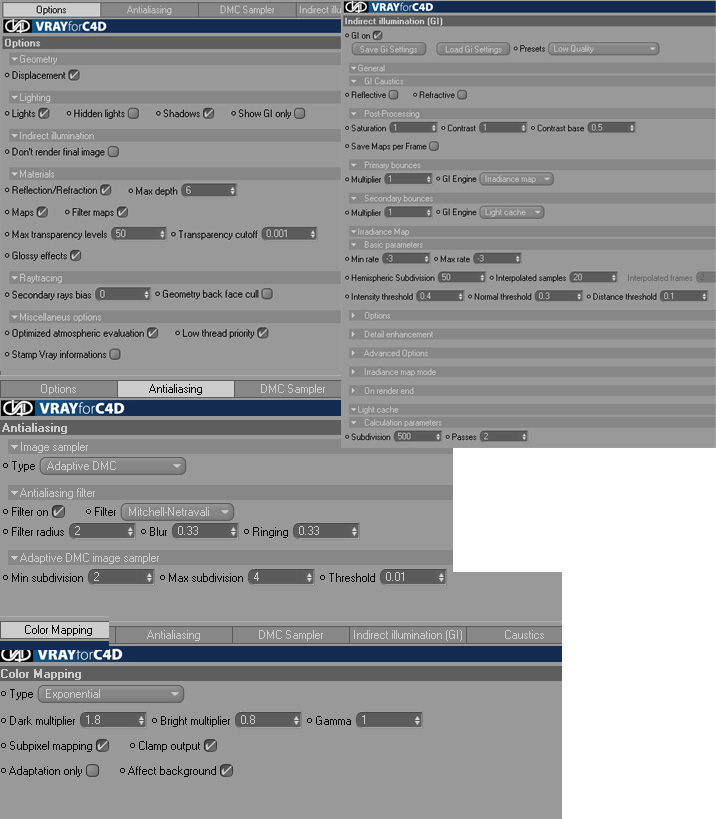 per quanto riguarda i tempi di renderizzazione non hai specificato nel secondo render quante passate di irradiance map hai impostato....sappi che dipende molto da lì...se metti -3,-3 faraà una sola passata, -3,-2 ne fara' due e cosi' via...ogni passata incrementa esponenzialmente il tempo di rendering, quindi per le prove è categorico -3,-3.