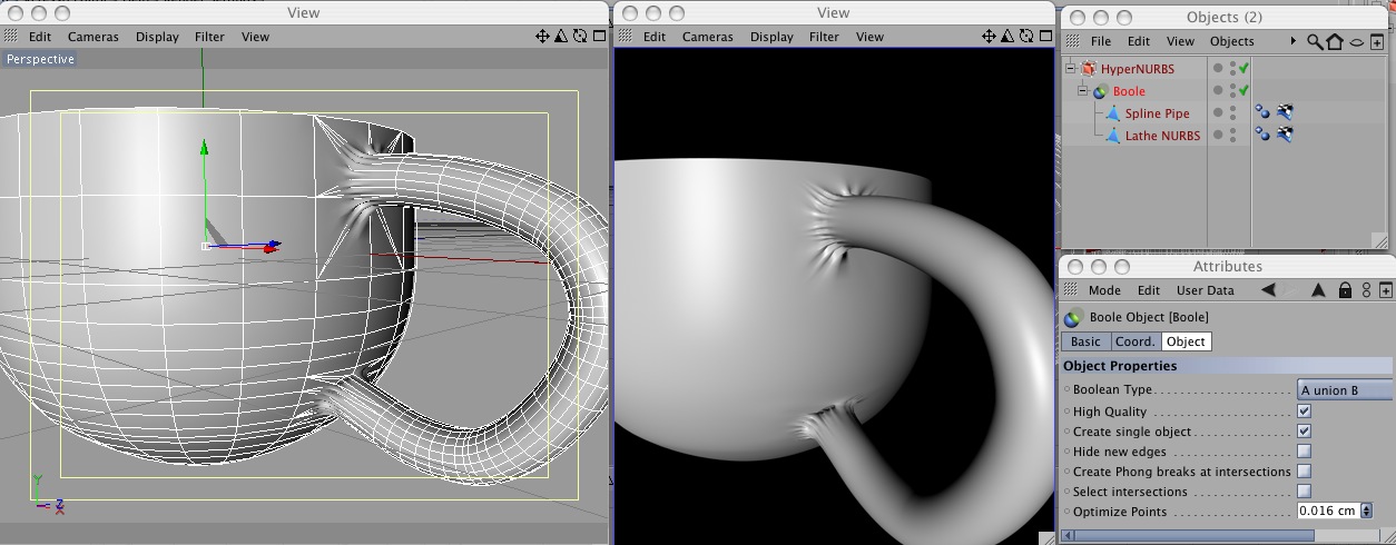 Mi stavo chiedendo, mettiamo che io abbia una tazza fatta con una rotazione NURBS alla quale voglio aggiungere un manico. Mettiamo anche che io non voglia modellare il manico semplicemente estrudendolo, ma che io abbia già un oggetto "manico" da "appiccicare" sulla tazza.